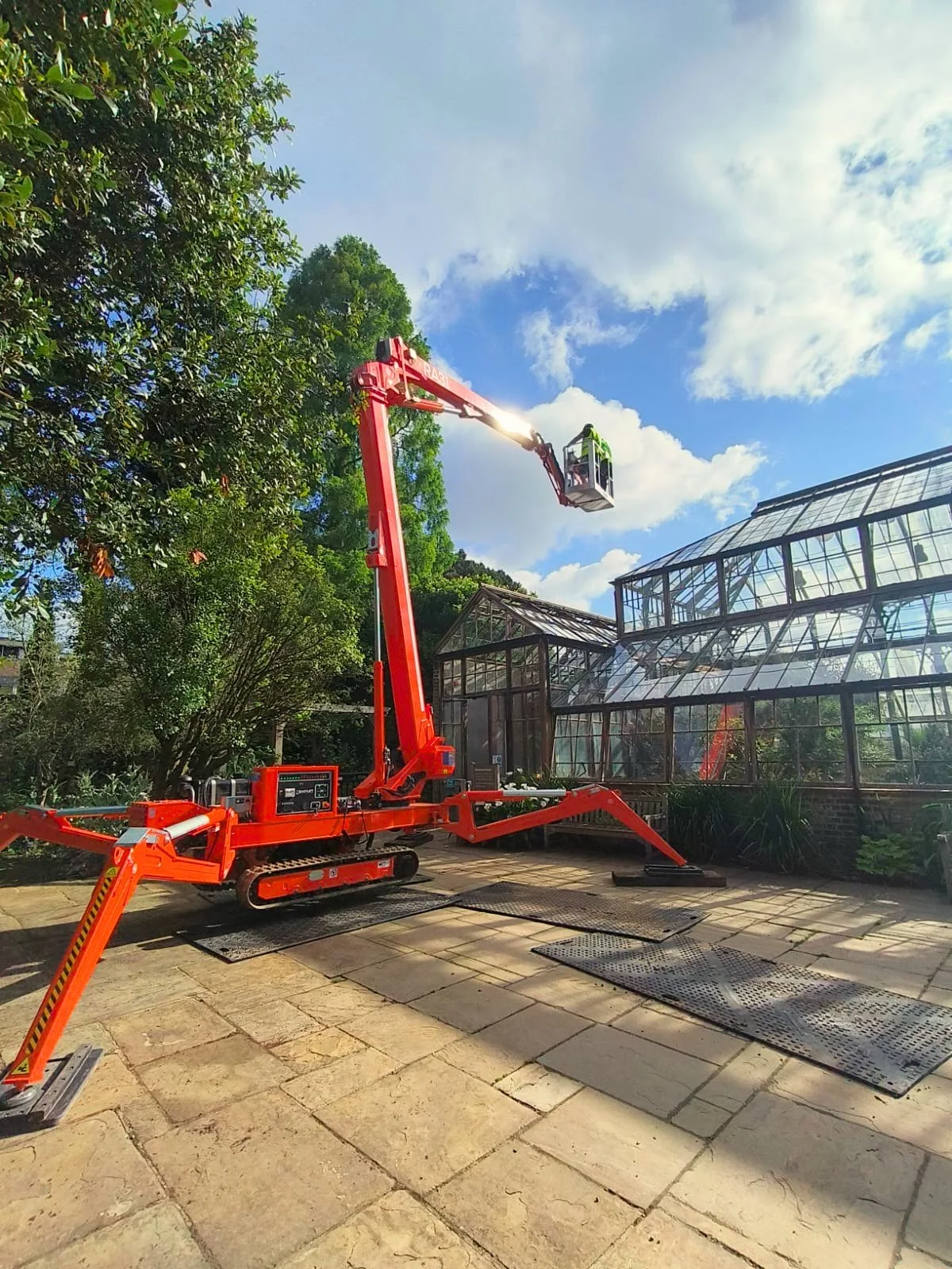 The project focused on replacing 20 damaged glass panels and realigning a further 20 that had shifted out of position. The work was carried on a greenhouse structure and required the use of specialist access equipment, including a 32 meter spider MEWP, along with roof ladders and scaffolding to reach different levels. All work was completed within a five day period.